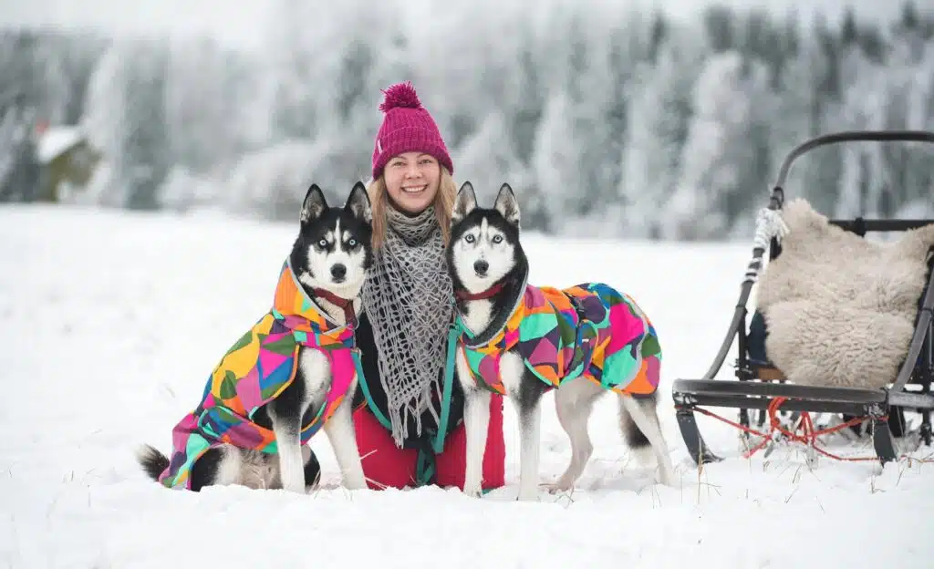 Oona Mäkiniemi hat zu Hause ein Rudel von zwölf Siberian Huskys und nimmt mit ihrem Hundeteam aktiv an Schlittenhunderennen teil. Es ist also keine Überraschung, dass Oona die Pflege von Sporthunden sowohl bei der Arbeit als auch zu Hause sehr vertraut ist. Huskys sind zwar für ihre hervorragende Wetterbeständigkeit bekannt, aber auch sie sind es gewohnt, regelmässig Mantel zu tragen, um warm und gesund zu bleiben.
